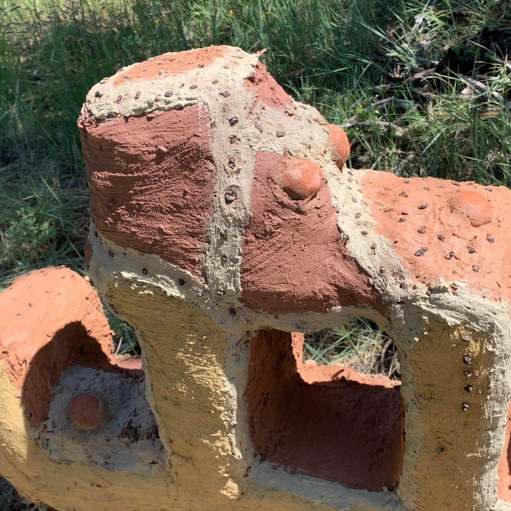 Ruben Olguin’s adobe sculptures slowly dissolve on site releasing grass, flower, shrub and tree seeds to begin the process of regenerating the native plant community.